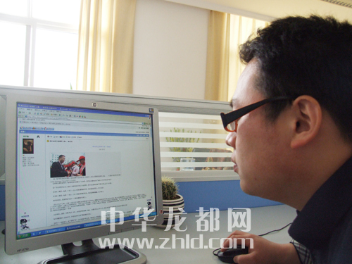 | 4月6日上午,一位網友在中華龍都網社區瀏覽帖子,了解孫自連事跡。 (戚永 攝) | |