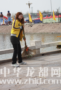 2010年4月2日,我在淮陽太昊陵廟會上,拍到了一個女孩與環衛工人一起勞動的畫面,她不是專業的環衛工人,但卻做起了太昊陵的“美容師”。