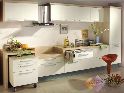 此外,吧臺或上下吊柜也都具有收納功能,一般吧臺可兼做早餐臺,高度以85公分最佳,用一般座椅即可,此吧臺還可當工作臺使用;超過100公分的吧臺,就需要使用高腳凳,不過,收納功能相對較強;吊柜也可做成有門片的雙面式或層板式,可收納雜物,層板可放餐杯或咖啡杯、酒杯等裝飾性的餐具。