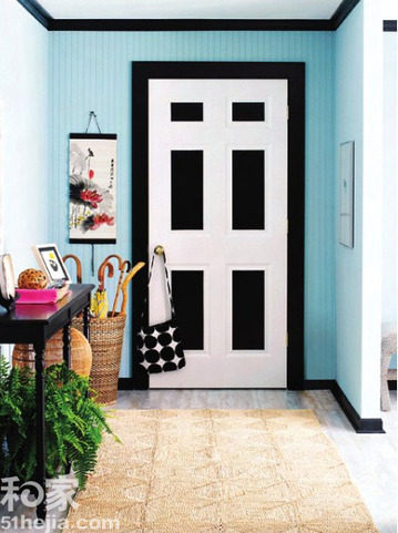 淡藍色的墻面令人心曠神怡,黑色石膏線的出現為門廳增添了幾分雅致。門板的處理想法大膽還透著點俏皮,淺色地毯沒有喧賓奪主,只是在空間中做了一個過渡。