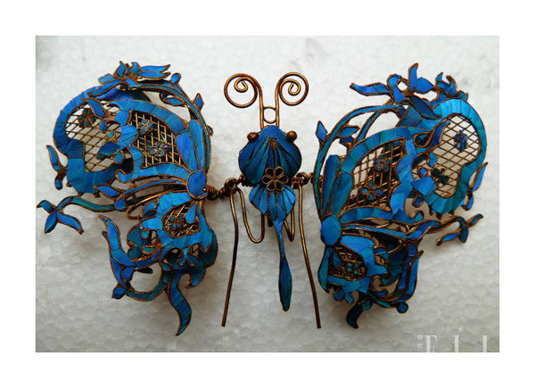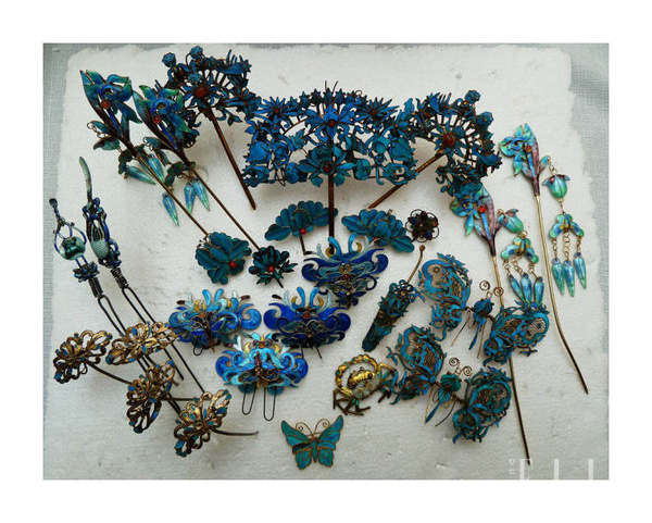 步步的頭飾品種很多,有渡金、銀、點翠、燒青、玉石、珍珠、花飾等等等,先介紹其中一部分點翠
