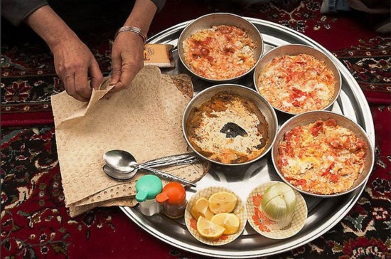 伊朗特色就是這些抹了黃油和果醬的烤餅面包。當這樣簡單的早餐不能滿足伊朗人的需要的時候,他們就會吃哈利姆。哈利姆是在一個巨大的容器中用小麥,肉掛,黃油和糖與肉絲共同混合烘焙而成的食物。加熱和放涼,哈利姆都可以食用。這里你也可以看到伊朗版本的煎蛋是什么樣子的