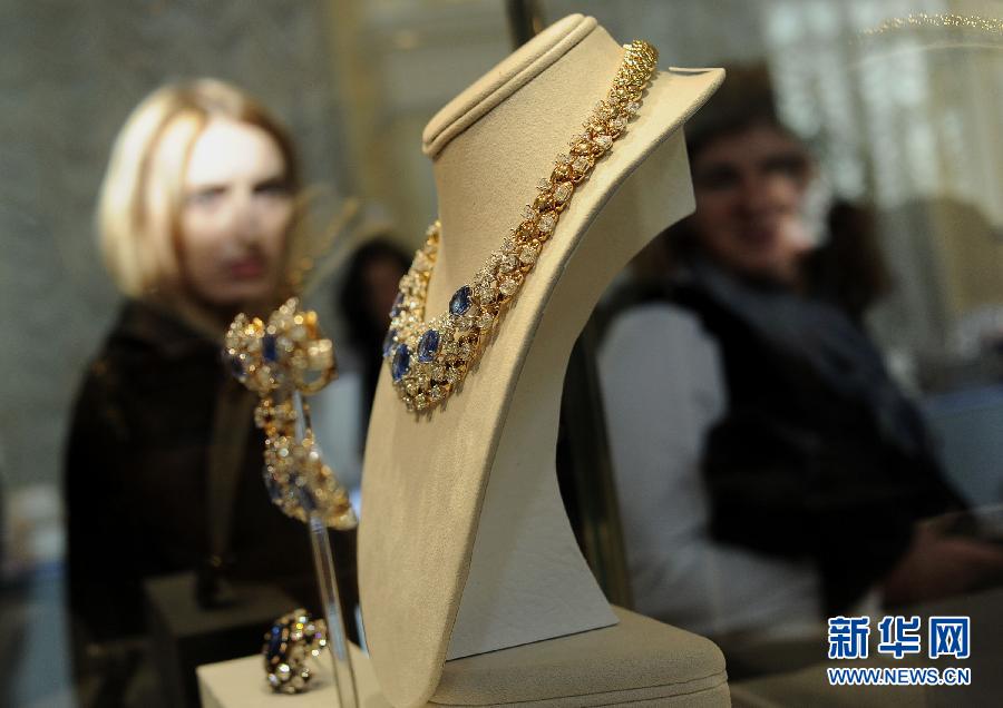 資料圖:9月14日,在俄羅斯首都莫斯科,一位婦女在伊麗莎白·泰勒珠寶展上欣賞展出的項鏈