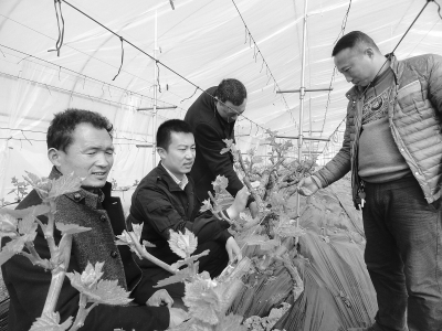 ????2月29日,榮獲“河南省十佳村官”的商水縣鄧城鎮“大學生村官”、駐許村第一書記張耀(左二)在自己創辦的百畝葡萄園里向葡萄種植戶傳授溫室葡萄管理技術。近兩年來,張耀在該鎮黨委、鎮政府的幫助下先后投資300多萬元創辦了百畝葡萄園,并幫助許村群眾發展葡萄、晚秋黃梨、蜜桃300多畝。 本報記者巴富強通訊員喬連軍攝