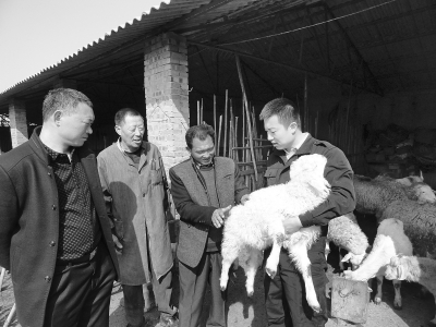 ?????2月29日,榮獲河南省十佳“村官”的商水縣鄧城鎮(zhèn)大學(xué)生“村官”、許村第一書(shū)記張耀(右一)在自己創(chuàng)辦的養(yǎng)羊場(chǎng)向養(yǎng)羊戶(hù)傳授養(yǎng)羊技術(shù)。近兩年,在張耀免費(fèi)提供技術(shù)、優(yōu)惠價(jià)提供種羊、負(fù)責(zé)銷(xiāo)售等幫助下,楊灣、吳灣、楊河、許村等行政村的300多戶(hù)群眾也通過(guò)發(fā)展養(yǎng)羊走上了致富之路。 喬連軍攝