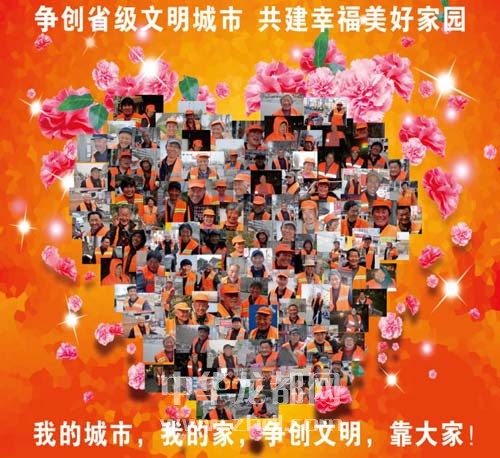 ????本報訊 經過幾個月的跟蹤拍攝,熱心市民王銀行已為周口中心城區的300多名環衛工人拍下笑臉和工作照。得知我市目前正在創建省級文明城市,王銀行特意用這些笑臉照片制作了一組以“我的城市我的家 創建文明靠大家”為主題的宣傳海報。此外,王銀行的朋友還為環衛工人譜寫一支歌曲。
