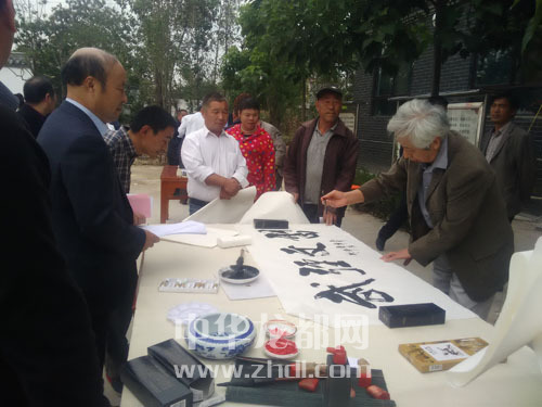 ????當日在李寨文化廣場舉行的啟動儀式上,46名省市書畫名家、志愿者同時亮相,主持人逐一介紹時,現場村民就開始摩拳擦掌,為求字求畫做準備。活動開始后,文化廣場上一字排開的書畫案臺很快被村民圍滿(如圖)。國家一級美術師、中國美術家協會會員翟東奇,北京榮寶齋畫院特約畫家朱文華等大家的作品更是供不應求。面對熱情的“粉絲”,書畫家們也被感染,揮毫潑墨一刻不停,送走最后一位村民,已是午后1時。