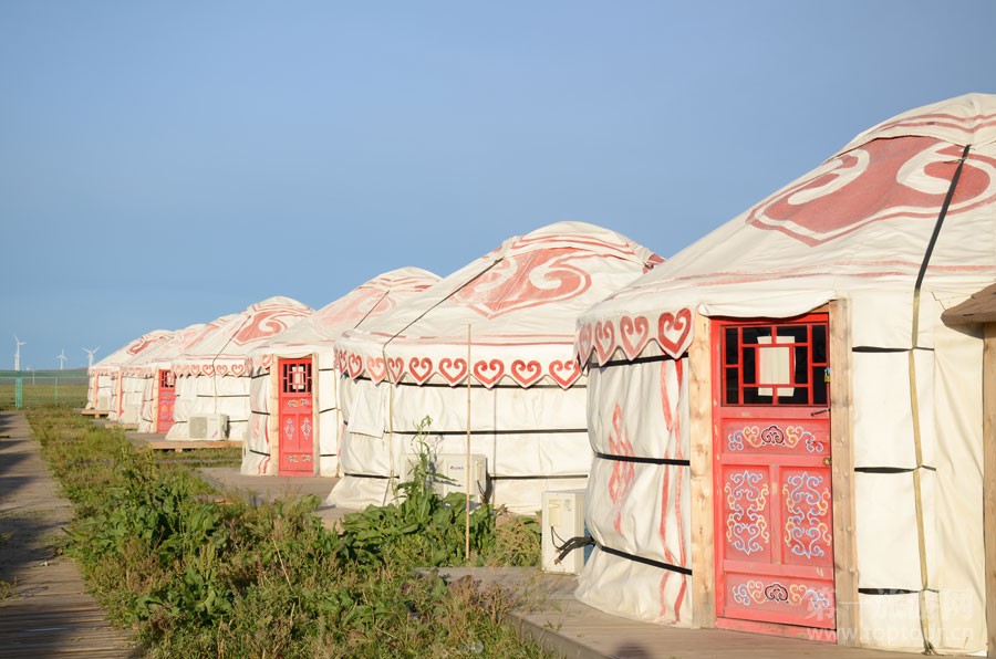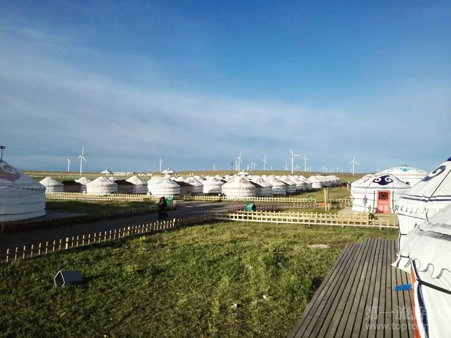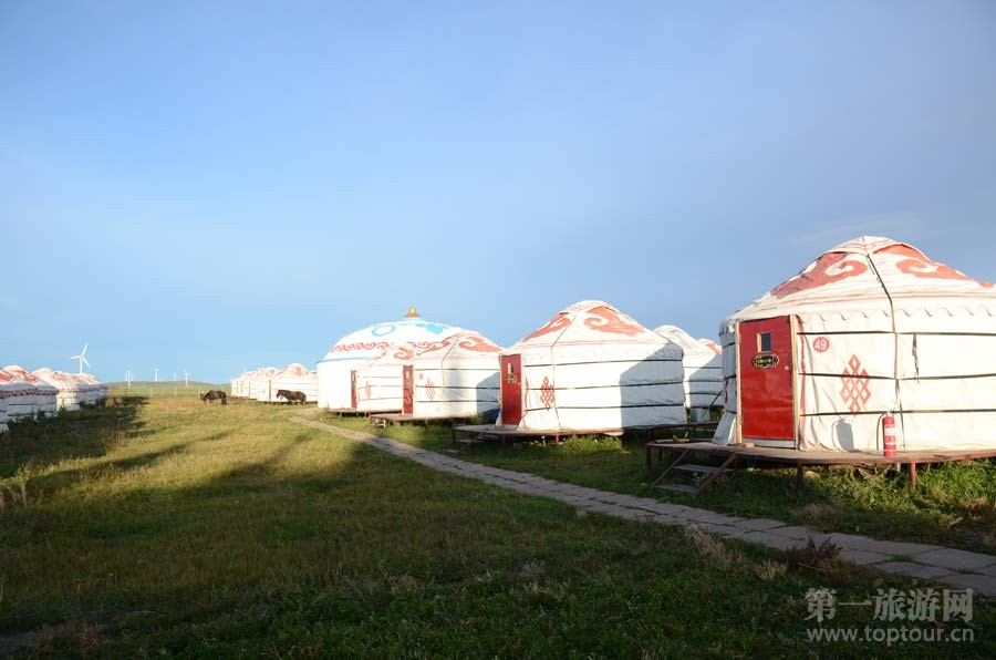 ????這里牛羊遍野、雄鷹飛翔,牧歌聲聲隨風(fēng)飄蕩;這里綠草如茵,鮮花斗艷,遍地的黃花閃耀金光,這里是位于內(nèi)蒙烏蘭察布的輝騰錫勒大草原。輝騰錫勒是蒙語(yǔ),意為寒冷的高原。九月剛過(guò),這里已秋意正濃,冷風(fēng)列列,大片大片的風(fēng)車矗立在遼闊的草原上。汽車穿行其間,碩大的風(fēng)車就在我們身邊不緊不慢地旋轉(zhuǎn)著,成為一道獨(dú)特的風(fēng)景。輝騰錫勒草原著名的黃花溝景區(qū),以鮮花草原著稱,蒙古包點(diǎn)綴在茫茫草原間,像一朵朵可愛(ài)的蘑菇。蒙古馬在我們住宿的蒙古包外悠閑地啃吃青草。入夜,皓月當(dāng)空,烤全羊的香味飄蕩在空氣中。蒙古包內(nèi),熱情的蒙古族漢子和姑娘,將對(duì)這片遼闊土地的熱愛(ài),化作豪邁而又渾厚的歌聲,醉倒游人一片!