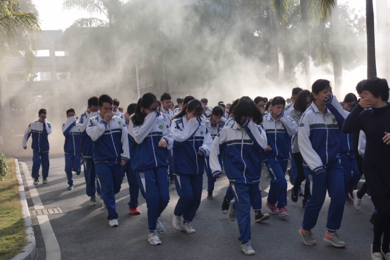 廣州市高中今天正式開學。廣州市第八十中學開學第一天的升旗儀式是在濃煙和警報聲中開始的。 6日早上九點,學生們剛剛結束“安全教育第一課”的理論學習,一場消防應急演練實操就開始了。警報一拉響,老師便迅速組織學生進行疏散逃生,學生們捂住口鼻,弓下身子,有序地沖出教室。五分鐘內,全體師生都順利疏散到操場上集合完畢。 將校園安全放在十分重要的位置,已經成為很多學校的常態,但把安全教育和消防演習作為“開學第一課”的內容尚屬首次。校長袁閩湘表示,廣州市第八十中學地處流溪河畔,105國道從校門口穿過,屬于典型的城鄉結合部學校,交通、防溺水、防火等安全教育和管理壓力較大。