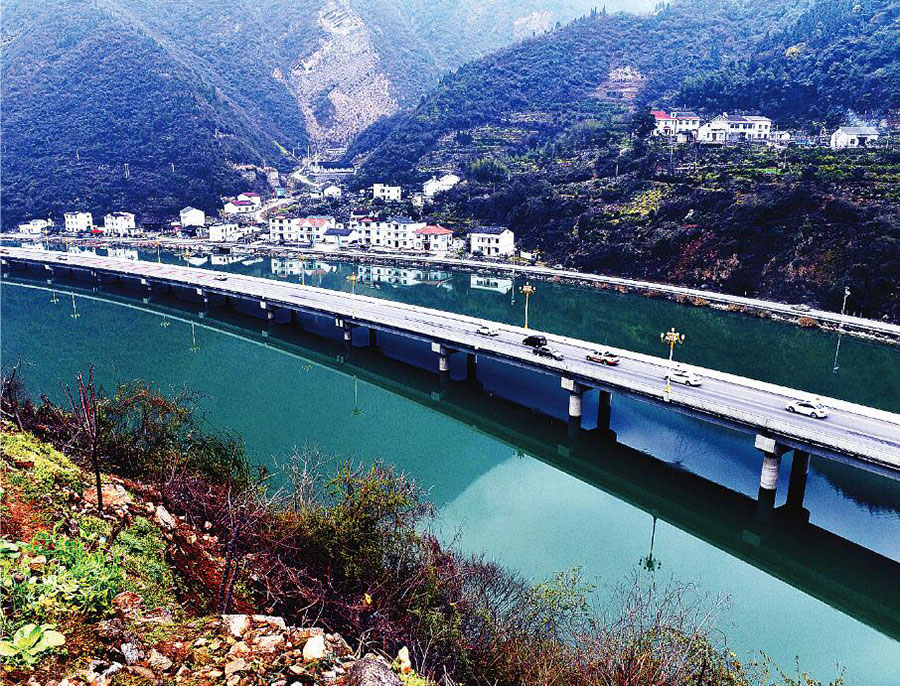 ????全長10.9公里的古(夫)昭(君)公路是宜巴高速連接興山新縣城和神農架林區的快速通道。由于地處三峽腹地香溪河峽谷、兩岸山勢陡峭,高5-8米、凈寬 12米的“迎賓大道”選擇打樁立柱,恰似“懸浮”在河面上,故有“中國最美水上公路”之稱。圖為湖北省興山縣古昭公路與周圍民居。饒國君/攝 來源:中國旅游報