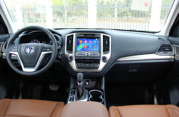 長安CS95采用大尺寸顯示屏搭配實體按鍵,兩側(cè)豎向設置了空調(diào)出風口,按鍵排布層次分明,但略顯繁雜。新車還配有三輻式多功能方向盤,門板以及換擋桿處增加了木紋裝飾,同時提供5座和7座兩種選擇。