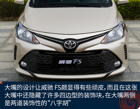 從外觀上我們也不難看出,威馳 FS與威馳一脈相承,正面看,甚至看不出兩車的差別,豐田最新的keen look設計讓車輛呈現出一種完全不同的年輕姿態,當然這也是目前豐田整個車系的主要設計語言,就是要讓車輛更顯年輕運動。大嘴的設計讓威馳 FS頗顯得有些頑皮,而且在這張大嘴中還隱藏了許多四邊型的裝飾塊,在大嘴兩側是兩道裝飾性的“八字胡”,除此之外是一雙大大的眼睛,這一副調皮可愛的模樣,相信不少年輕人都會喜歡。