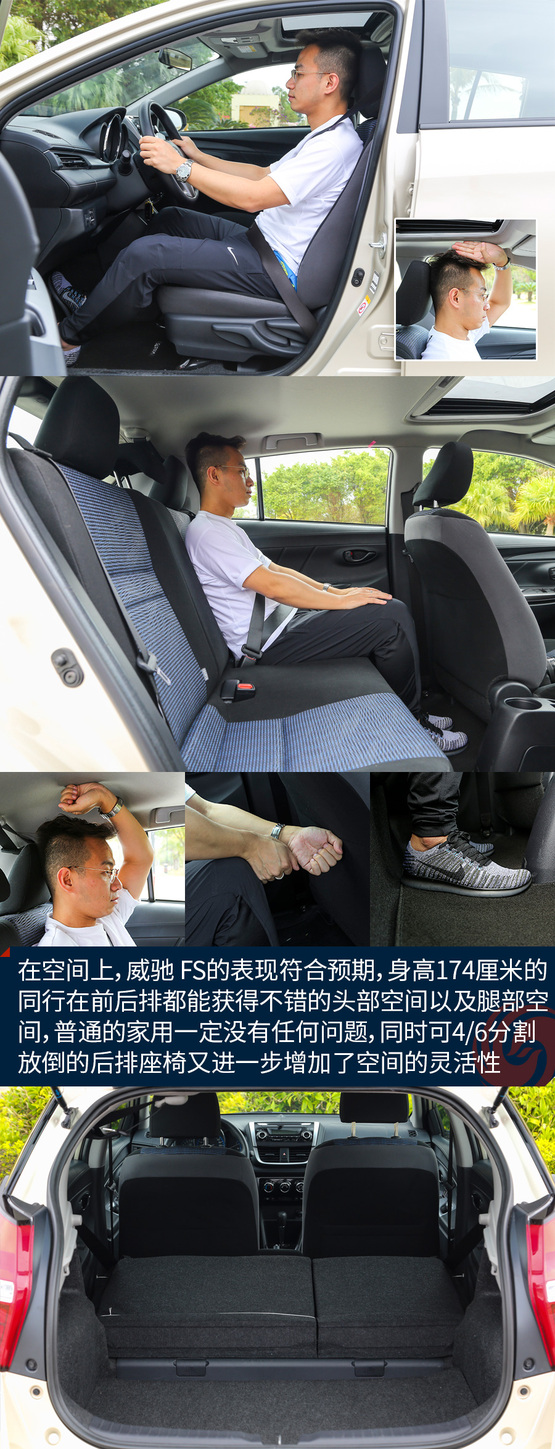 在空間上,威馳 FS的表現符合預期,身高174厘米的同行在前后排都能獲得不錯的頭部空間以及腿部空間,普通的家用一定沒有任何問題,同時可4/6分割放倒的后排座椅又進一步增加了空間的靈活性,即使是放置一些大件的行李或物品也不會尷尬。