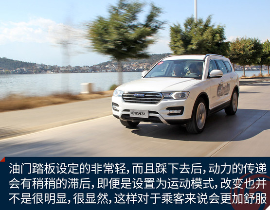 既然是7座車型,藍標H7L在調校方面也更加注重舒適,這一點從油門踏板可以很明顯的感覺到。油門踏板設定的非常輕,而且踩下去后,動力的傳遞會有稍稍的滯后,即便是設置為運動模式,改變也并不是很明顯,很顯然,這樣對于乘客來說會更加舒服。相比于油門踏板,剎車踏板則力度適中且比較線性。