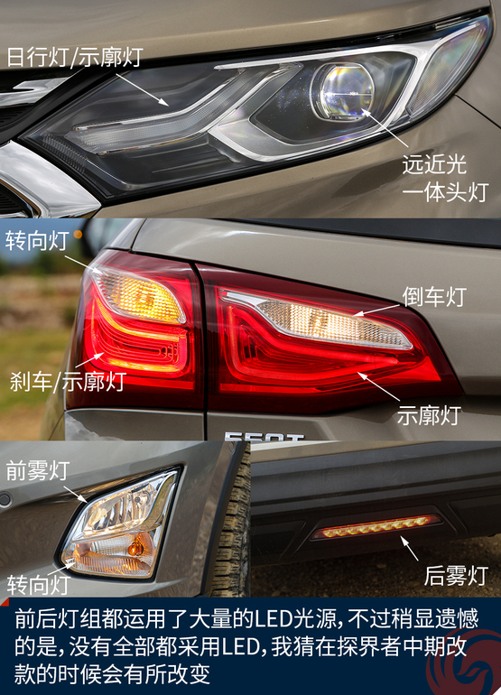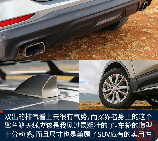 外觀上令我印象深刻的地方有這么幾個,首先前后燈組都運用了大量的LED光源,不過稍顯遺憾的是,沒有全部都采用LED,我猜在探界者中期改款的時候會有所改變。四個車門下部包邊的設計能夠減少下車弄臟褲腿時的尷尬。車頂的行李架真的可用,而且據說早期購買探界者的朋友還能獲得車頂的行李箱,十分實用。雙出的排氣看上去很有氣勢,而探界者身上的這個鯊魚鰭天線應該是我見過最粗壯的了。車輪的造型十分動感,而且尺寸也是兼顧了SUV應有的實用性。