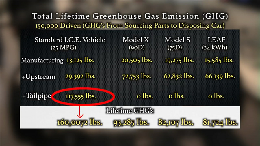 ????????這張表更加清晰,分別統計了普通內燃機汽車(25MPG=百公里油耗9.4升)、特斯拉Model X 90D、Model S 75D和聆風(電池容量24kWh)在車輛生產,燃油/電能生產過程以及駕駛使用過程中的排放,可以看到,盡管電動車在車輛生產、電能生產過程中產生的排放更高,但行駛工程中的零排放仍然使其在整個生命周期中的排放更低。