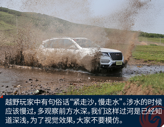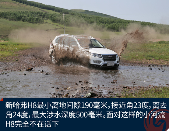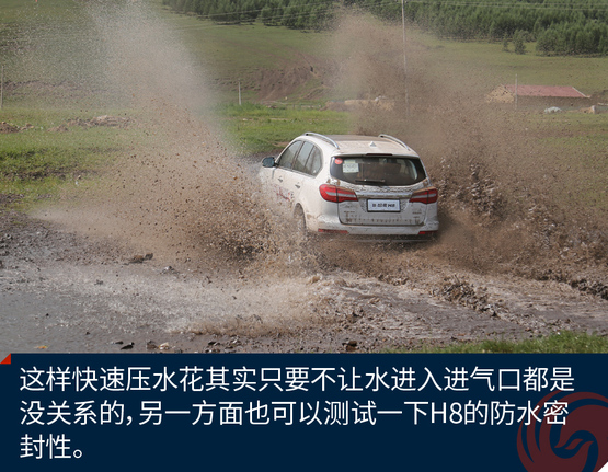 ????????涉水測試對于新哈弗H8來說簡直是小菜一碟,190mm的離地間隙,500mm的最大涉水高度,這條小河完全阻擋不了H8的腳步。俗話說“緊走沙,慢走水”是對于路況不清楚的水域,萬一進(jìn)氣系統(tǒng)進(jìn)水,發(fā)動(dòng)機(jī)就會(huì)熄火。所以一定要小心涉水深度。像我們這么莽撞的壓水花,是在水域已經(jīng)探明的情況下。