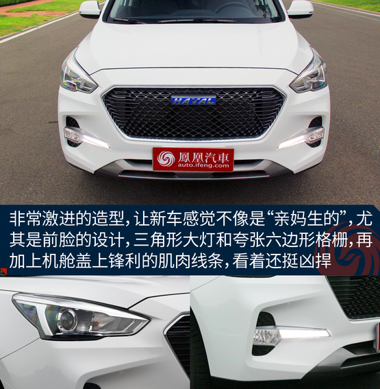 ????????前面曾說,M6的樣子是最不哈弗的,主要是它采用了全新的外觀設計風格,前臉以大量平直的線條勾勒出凌厲的造型。六邊形網狀前進氣格柵搭配棱角分明的前大燈組,特意把它年輕、時尚的一面體現的很明顯。此外,大燈組下方的進氣口以及大尺寸的LED日間行車燈設計給整車起到了畫龍點睛的作用。