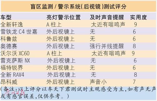 測試車型當中,同樣不會吵的,還有雪鐵龍C4世嘉、福特銳界、雷克薩斯NX等車型,對盲區內的車輛感應非常靈敏,當我們駕駛車輛將要變換車道,而側后方雷達同時感應到有車輛進入后視鏡盲點區域時,外后視鏡上的指示燈就會閃爍,提醒駕駛者注意后車。