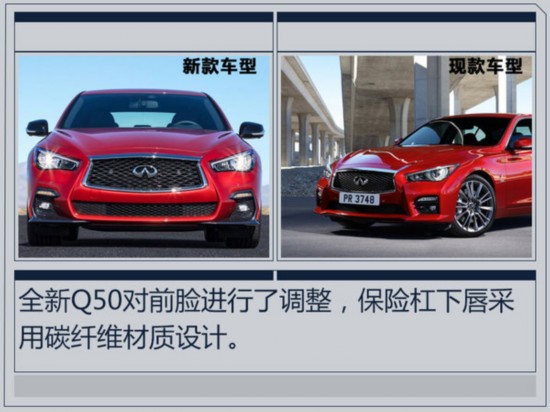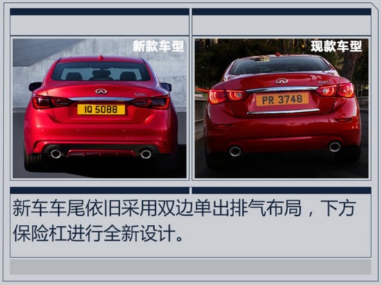 全新英菲尼迪Q50對外觀進(jìn)行了調(diào)整,前臉采用上下分體式格柵設(shè)計(jì),上格柵為網(wǎng)狀造型,保險(xiǎn)杠下唇為碳纖維材質(zhì)。車尾取消了車牌下方鍍鉻飾條以及兩側(cè)反光板,下方保險(xiǎn)杠換裝黑紅雙色護(hù)板。