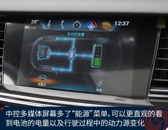 ????????中控多媒體屏幕多了“能源”菜單,點(diǎn)進(jìn)去可以更直觀的看到電池的電量以及行駛過程中的動力源變化。