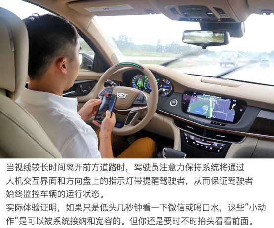????????原則上駕駛員應該緊盯前方,時刻準備著接管汽車的控制權。但實際上基于ACC自適應巡航系統的Super Cruise?超級巡航為行駛中的汽車提供了充足的“安全緩沖余量”。在底特律郊區高速公路上實際體驗證明,視線短暫的離開正前方(大約3-5秒之內)處于系統安全的“可接受”范圍內,比如喝水、吃東西或者調節空調多媒體娛樂系統,這些操作都沒什么問題。