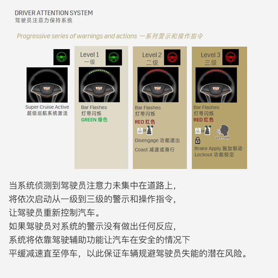 ????????若這個級別的警示還不能“喚醒”駕駛者,超級巡航系統將自動開啟雙閃、利用車輛輔助駕駛系統控制汽車逐漸減速并在路邊停車,然后OnStar安吉星工作人員將會通過遠程對話介入以防止駕駛者因為“失能”造成更多不可預知的危險。