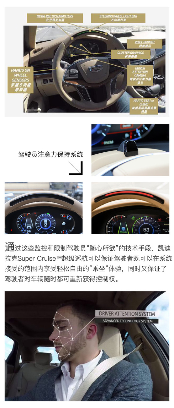 ????????但問題是,當一臺車自己好好的行駛在高速公路上,人性驅使下的駕駛員很容易把注意力轉移到其它地方,這就造成了極大的安全隱患。所以凱迪拉克Super Cruise?超級巡航系統最與眾不同的地方,也是讓我覺得最有價推廣價值的設計理念,是通過駕駛員注意力保持系統與高精度地圖數據緊密結合?,主動監測駕駛員的狀態并做出及時回應。這套系統能督促駕駛者始終保持對車輛運行狀態的有效監控,這給其釋放雙手的駕駛輔助功能帶來更安全、更自信的使用體驗。