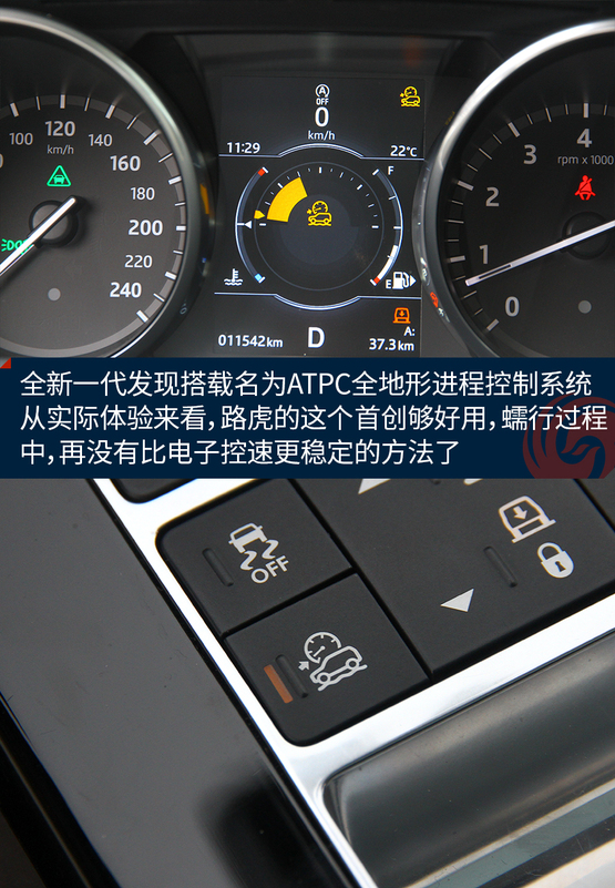 全新一代發現搭載名為ATPC全地形進程控制系統,簡單可以理解為這套系統將一般道路上的定速巡航概念移植到了越野功能上,設定好預計速度,車輛便可相對應地自動調整油門或剎車。