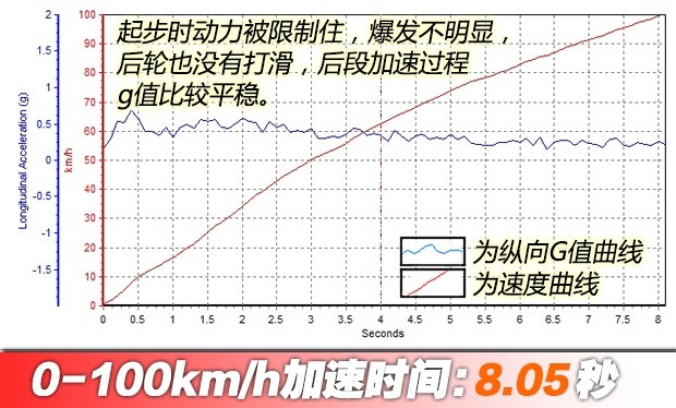 ????雖然可以關閉穩定系統,但感覺卻對發動機輸出非常保守,變速箱也不允許拉到很高的轉速。起步后車輪沒有明顯滑動,說明并沒有達到最佳輸出狀態,最終成績為8.05秒,成績與老款車型有差距,略有遺憾。