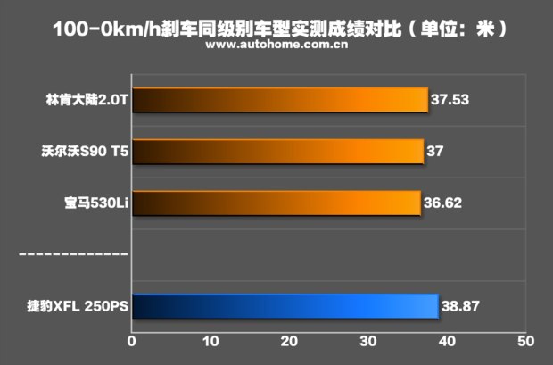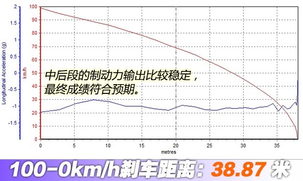 ????全力制動時車身有點頭的現象,但車身總體保持穩定,最終成績為38.87米,表現符合預期。這個成績在汽車之家的評價體系中,也屬于優秀水平。