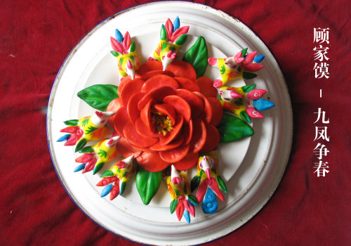 “在彩繪著色上,顧家饃使用分層著色法。以黃色襯底為主色,紅色點(diǎn)睛,藍(lán)、黑、青等色勾架描脈絡(luò)花紋。同時(shí),注重彩繪與勾線(xiàn)相結(jié)合,以色傳神,以神著色,從而形成了色彩艷麗而不俗,美而不妖不媚的境地,充分顯示出了喜慶、祥和的韻致。”顧家饃第十六代傳人顧體成介紹說(shuō)。