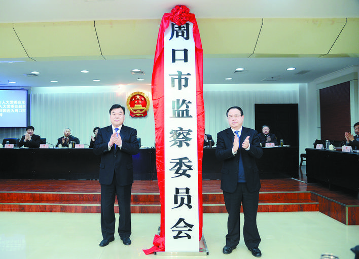 劉繼標(biāo)、劉國(guó)連為新成立的周口市監(jiān)察委員會(huì)揭牌,標(biāo)志著我市深化國(guó)家監(jiān)察體制改革試點(diǎn)工作邁出了關(guān)鍵性一步,標(biāo)志著肩負(fù)全市公職人員監(jiān)察職責(zé)的新部門——周口市監(jiān)察委員會(huì)正式成立。
