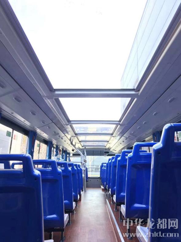 記者順著步梯來到第二層,視野頓時開闊起來。原來該層頂部設計有6塊全景天窗,乘客坐在第二層不但不會有壓抑的感覺,反而會視野開闊,便于游覽周口街景。記者注意到,在全景天窗下面有遮陽板,乘客可以用來遮擋陽光。