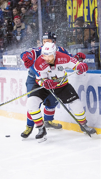 北京昆侖鴻星隊在大陸冰球聯賽(KHL)中對戰俄羅斯圣彼得堡陸軍隊。新華社記者吳壯攝