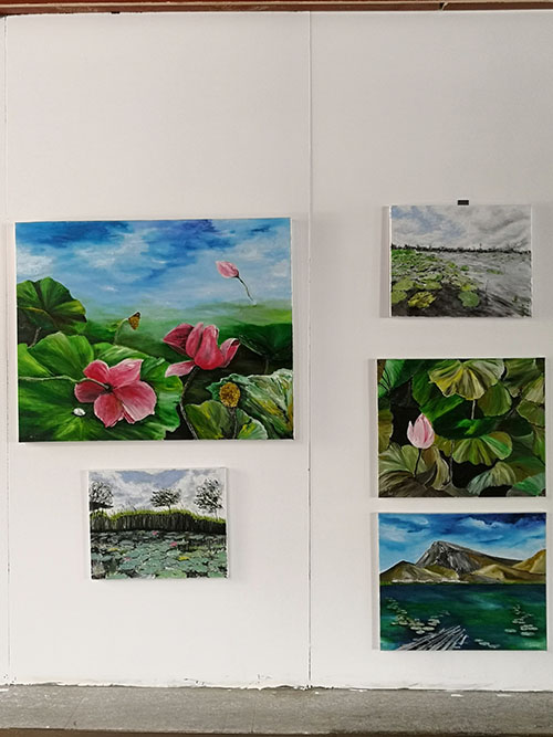 在龍湖荷花盛開的季節(jié),女詩人油畫家三色堇、娜仁琪琪格、愛斐兒、暖玉、白芳芳、劉文文一行6人,來到周口進行寫生觀摩,開展老莊文化交流、伏羲太極文化傳播等公益活動。7月17日上午開展女詩人油畫家寫生作品展,豐富多樣的活動成為淮陽荷花節(jié)一濃墨重彩的一筆。