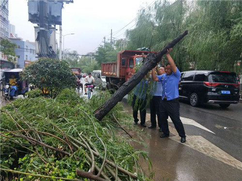 在S102西沙河大橋北,暴風雨刮倒路樹。川匯區公路局接報后,立即組織養護搶險人員冒雨用手和工具清理倒伏路樹。下午2時,經過兩個小時的緊張工作,相關路段恢復正常通車。