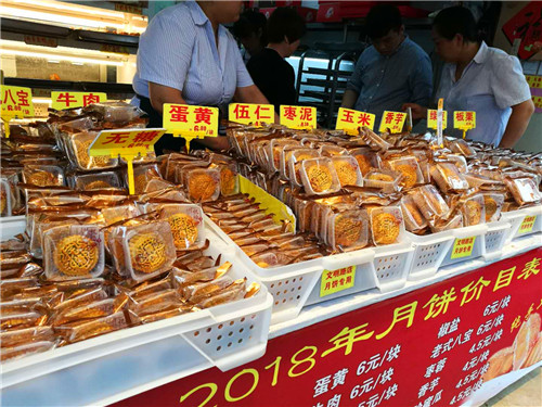 “給我拿兩斤青紅絲酥皮和五仁的。”一位50出頭的女士邊付錢邊說,小時候,過中秋節,一家人圍坐一起吃這種半斤重的老式月餅,一個月餅分八塊,一人一塊,現在回想起來,“真甜”!
