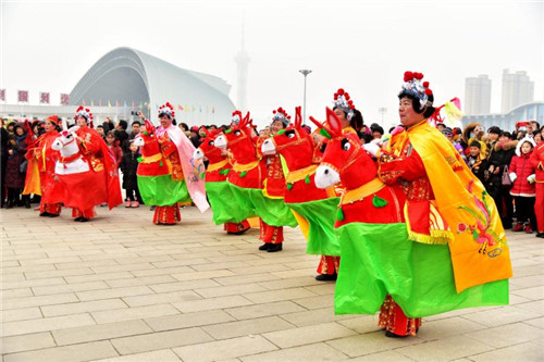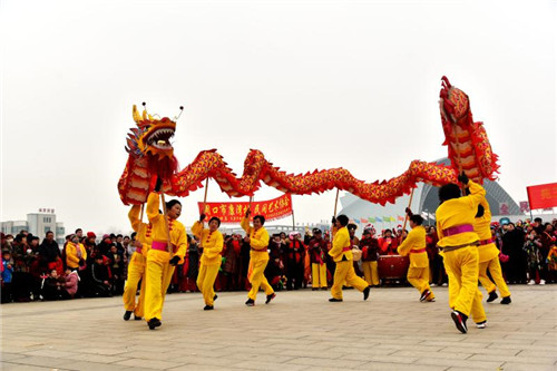 展演現場,人頭攢動,鑼鼓喧囂,16名身穿金黃、亮藍衣服的舞龍隊員率先登場,金燦燦的巨龍時而甩尾前行,時而昂首盤踞,浩浩蕩蕩;8只舞獅歡騰雀躍、活靈活現;精美的裝飾的旱船穿行其中,老生、老旦扮相的隊員邊走邊唱;整齊劃一的腰鼓隊以及隊形優美的擔經挑把現場氣氛推向高潮……持續近2小時的展演活動中,精彩的民俗表演令人目不暇接,為這座城市增添了濃濃的年味。