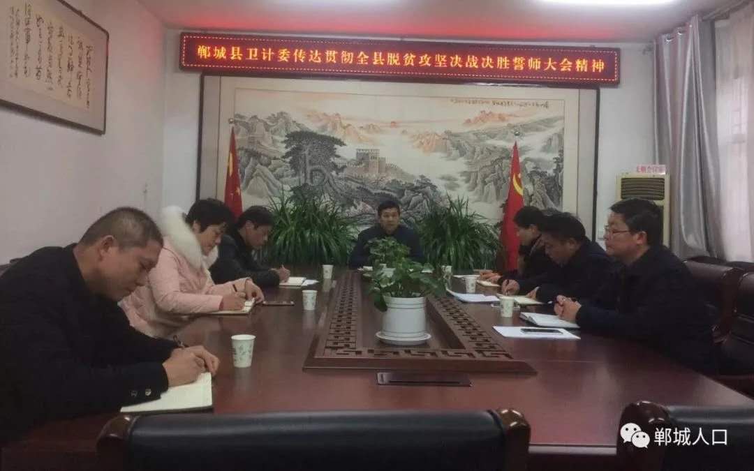 2月13日,鄲城縣脫貧摘帽決戰決勝誓師大會在縣人民會堂隆重召開。下午,縣衛計委及時組織召開了委全體班子成員工作會,會議認真傳達學習了全縣脫貧摘帽決戰決勝誓師大會精神,重點學習了縣委書記羅文閣、縣長李全林等領導在大會上的重要講話精神,同時對全縣衛生計生系統2019年脫貧攻堅重點工作任務作了統一安排部署。