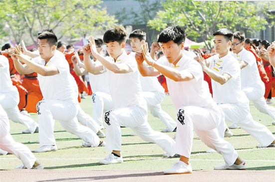 4月18日上午,周口師范學院第十五屆田徑運動會開幕,來自該校各個學院的數(shù)千名學子投入運動會健身活動中。700多名大學生在運動會上集體表演了心意六合拳,受到觀眾熱捧。記者 梁照曾 攝