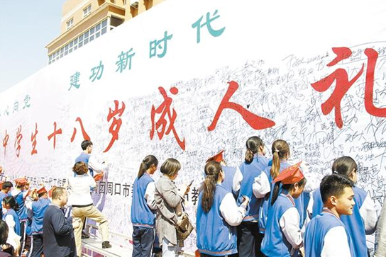 行“拜謝禮”,戴“成人帽”,入“成人門”……4月18日上午,由團市委聯合市委政法委、市關工委、市教體局、周口城鄉一體化示范區舉辦的“青春心向黨、建功新時代”周口市中學生十八歲成人禮在周口市文昌中學舉行。圖為學生們正在許愿墻上簽名。 記者 劉華志 攝