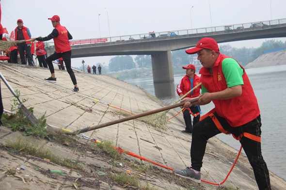 當天上午,志愿者拿著掃帚、鐵锨等工具,對堤坡的塑料袋、礦泉水瓶等垃圾進行清理,還有一些志愿者負責清理河堤上的垃圾。雖然垃圾雜物又臟又臭,但是志愿者相互協作,干得熱火朝天。