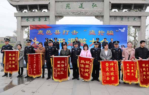 4月25日上午,鹿邑縣召開打擊“盜搶騙”專項(xiàng)行動(dòng)公開退贓大會(huì)。縣委常委、政法委書記侯自峰出席會(huì)議并講話。縣公、檢、法、司等有關(guān)部門負(fù)責(zé)人與群眾代表近300人參加退贓大會(huì)。