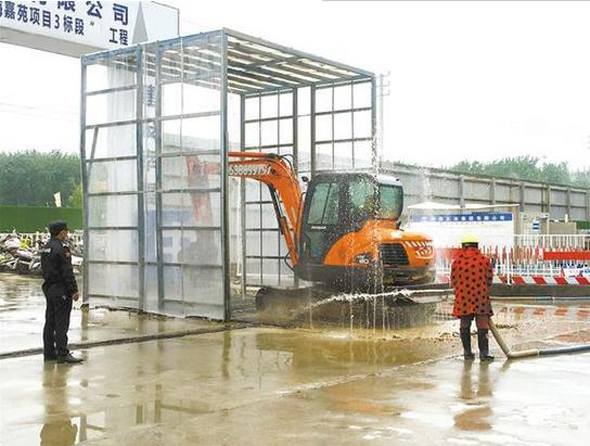 4月27日上午,川匯區一工地大門口,準備駛出工地的工程車正接受清洗。工作人員說,每輛工程車都有規定的清洗時間,一般是兩分多鐘,保證從工地出去的車輛干干凈凈。記者 王凱 攝