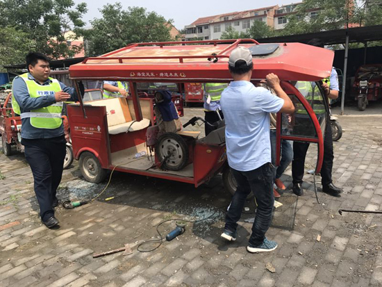 近日,鄲城縣城區道路交通秩序整治辦公室對半年來依法查扣的41輛非法營運三輪車進行集中切割去頂,銷毀或變為普通家用三輪車由車主領回,有效震懾了車輛非法營運行為,全面凈化了道路交通環境。