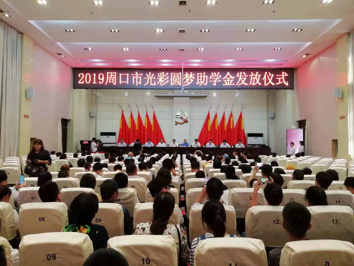 8月30日上午,2019年周口市“光彩圓夢”助學金發放儀式在川匯區舉行。市政協副主席、市工商聯主席趙萬俊,老領導李紹彬、白明寬,市委統戰部副部長、市工商聯黨組書記李飛,川匯區區委書記李宗喜,市工商聯副主席、周口市商會黨委書記徐公俊,市扶貧辦副主任程衛東,川匯區區委常委、統戰部長宋煜及市直、區直有關單位負責同志出席儀式。