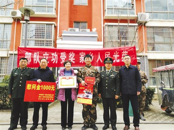 1月21日上午,川匯區人武部相關負責人來到市城鄉一體化示范區,向現役軍人趙翔宇家中送去喜報和慰問金。