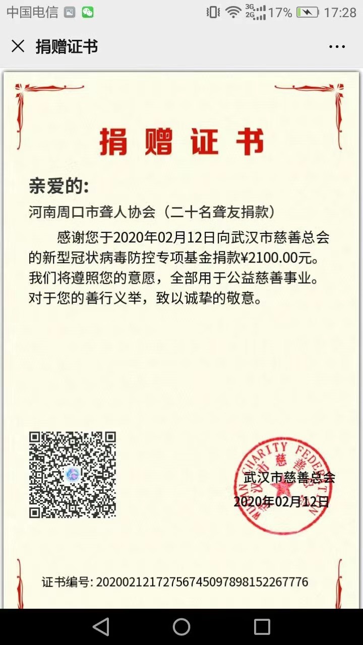 2月12日,2100元的捐款轉到了武漢市慈善總會,這是來自河南周口市聾人協會20名聾友的一份愛心。