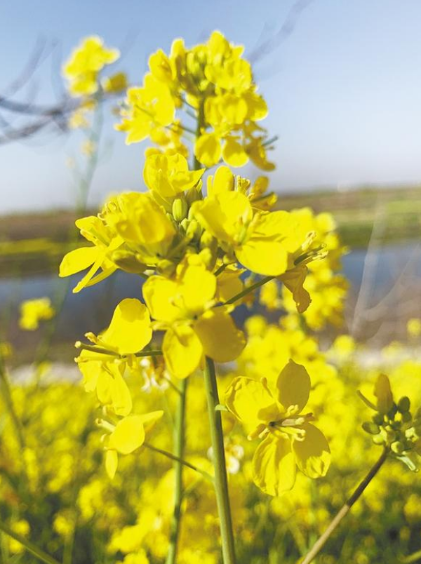 進入油菜開花時節,田野間一片金黃。油菜花競相怒放,千姿百態,花團錦簇,放眼望去,花海十分壯觀,大地都像披著一塊金黃的地毯?;ǚ壑泻胸S富的花蜜,引來彩蝶與蜜蜂飛舞,美麗風景讓人流連。